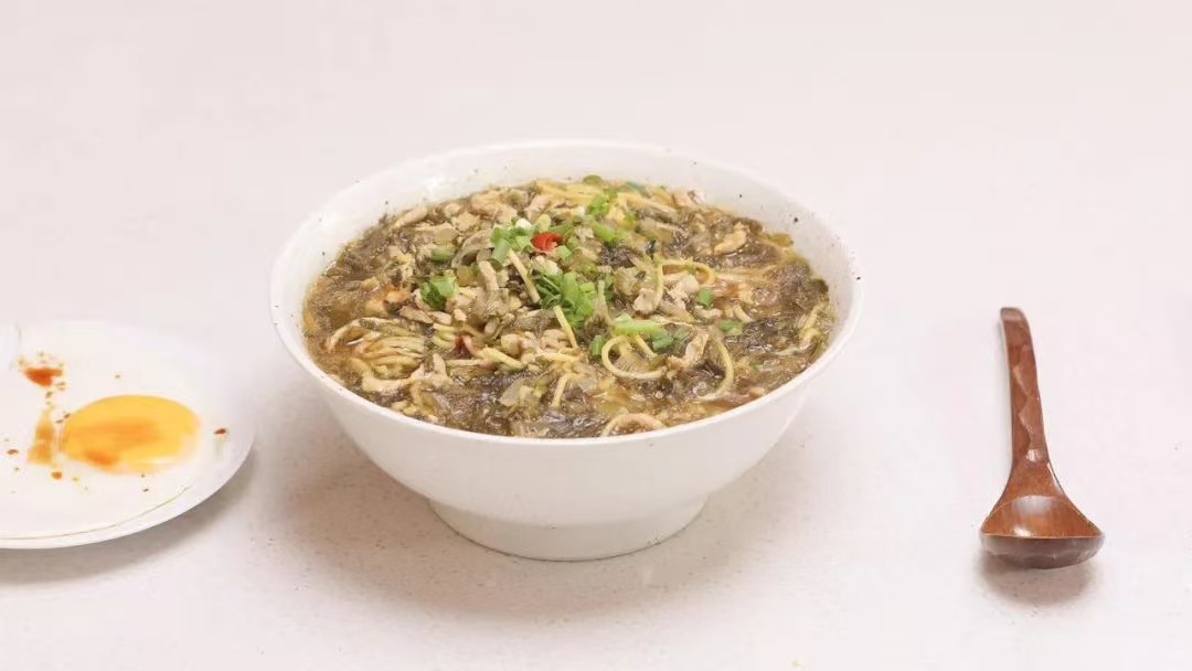 - 原料:面條100克,豬肉絲60克,雪菜30克,鹽、蔥花、姜末、高湯各適量。